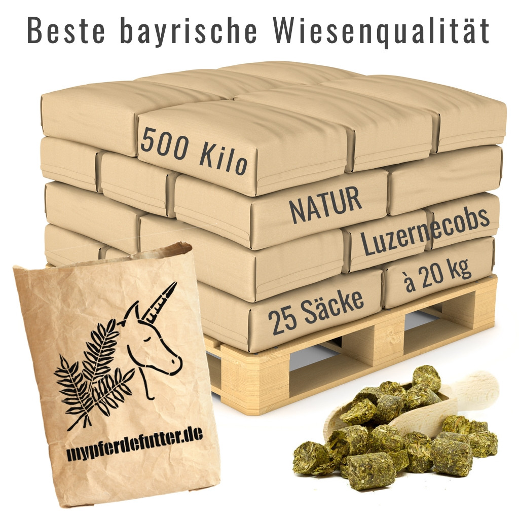 Unsere Luzerne ist ein in Bayern angebautes und getrocknetes Naturprodukt, welches auch für ältere Pferde sehr gut als Heuersatz geeignet ist. Aber auch Pferden mit Zahnproblemen profitieren von unseren Luzernecobs.